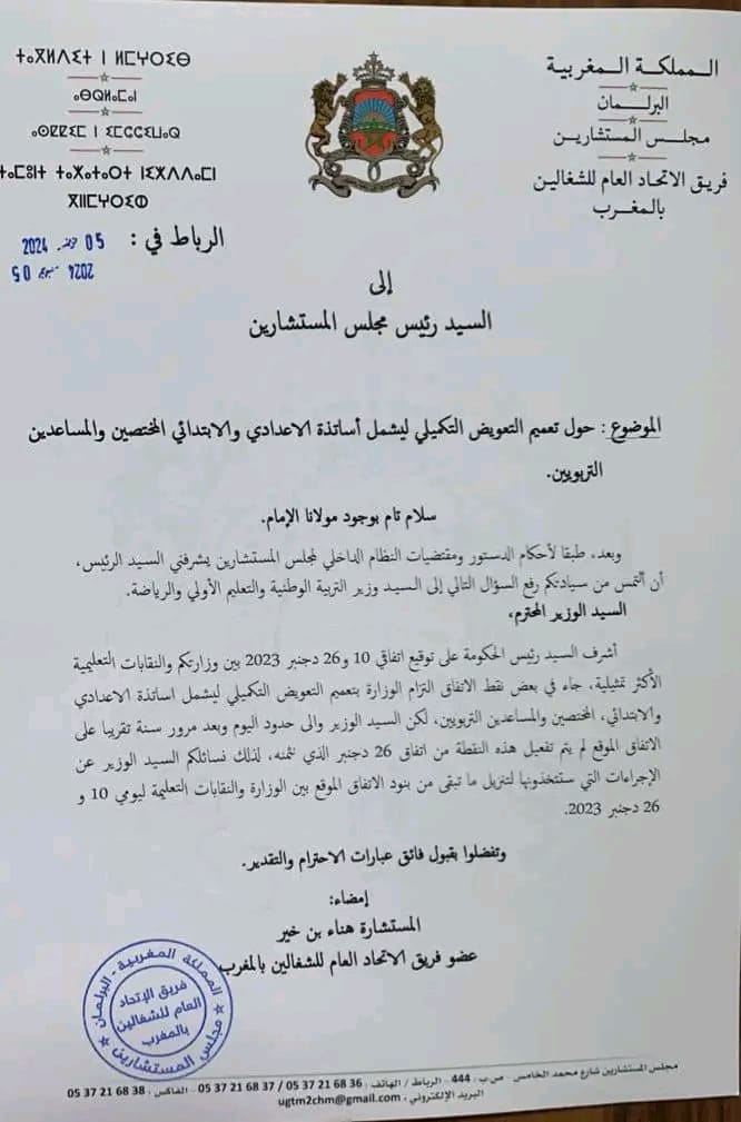 حول تعميم التعويض التكميلي ليشمل أساتذة الاعدادي والابتدائي و المختصين والمساعدين التربويين