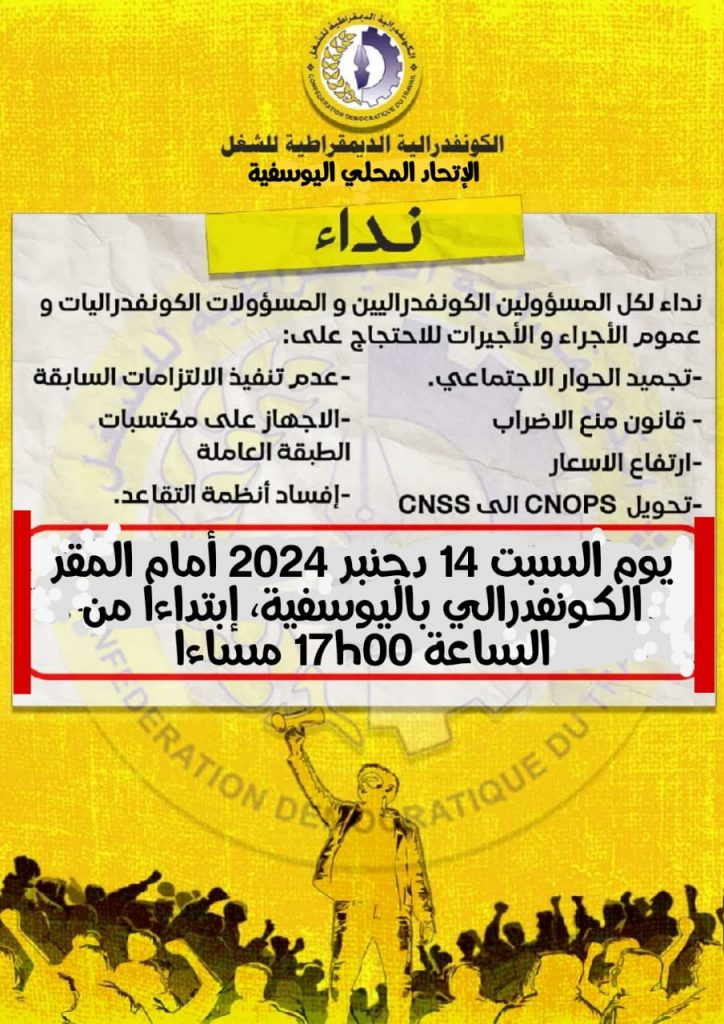 وبناء على ما سبق فان الاتحاد الاقليمي الكونفدرالي باليوسفية يدعو جميع المكاتب النقابية في القطاعات المهيكلة نقابيا العامة والخاصة وعموم الموظفين والموظفات بالقطاع العام والخاص والشبه الخاص وجميع المواطنين والمواطنات الى المشاركة الواسعة في التجمع الاحتجاجي و التنديدي بما تخطط له الحكومة من اقدامها على تمرير قوانين اجتماعية تراجعية من ضمنها مشروع القانون التنظيمي التكبيلي للاضراب وتجريمه بعدة طرق مباشرة وأخرى مبطنة في تواطؤ مكشوف مع الباطرونا لخدمة مصالحها على حساب هضم حقوق العمال والعاملات وتكبيل نضالاتها ضاربة عرض الحائط حقها في ممارسة الاضراب المكفول دستوريا للدفاع عن مطالبها وصيانة مكتسباتها وذلك يوم السبت 14 دجنبر 2024 أمام مقر الكونفدرالية الديمقراطية للشغل الكائن قرب محطة القطار والحديقة الجديدة ابتداء من الساعة الخامسة مساء .