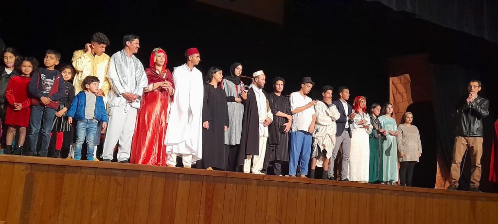 كما نجحت المسرحية في أن تكون مسرحية احتفالية بامتياز متحت من التراث ، واستدعت أدبا شعبيا وشخصيات تاريخية وتحيينها لرصد واقع ومجتمع متفاعل مع فن، أساسه القول والكلام المنظوم، قادر على التعبير على كلما يختلج الجوانح ، وممتد إلى كل المواضيع القضايا ليكون احتفالا يتجاوز الاقتصار عليه كظاهرة فنية مرتبطة بشوط اجتماعية معينة، إلى ظاهرة اجتماعية مرتبطة بالإنسان أينما وجد متحررة من الزمن فكانت كل الشخصيات واعية بتحرر قصيدة الملحون وربط المسرح بما بقع “هنا” وما يحدث “الآن” وتحرير الفن المسرحي من كل القيود الموروثة أو المؤسساتية التي تحاول تنميطه، أو ربطه بجغرافية معينة تجعل هم المهتمين به اقتباس نصوص من الآخر هناك….