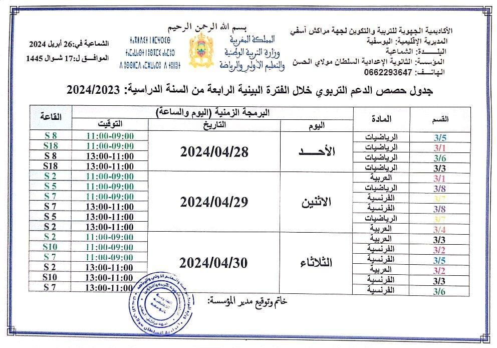 لهذا تهيب إدار ة المؤسسة بالآباء والأمهات إلى حث أبنائهم وبناتهم للحضور بكثافة إلى حصص الدعم المقررة وفق البرنامج أسفله. كما تلتمس إدارة المؤسسة من السلطات المحلية العمل على توفير وسائل النقل المدرسي خلال الفترة المخصصة لتقديم حصص الدعم التربوي.
