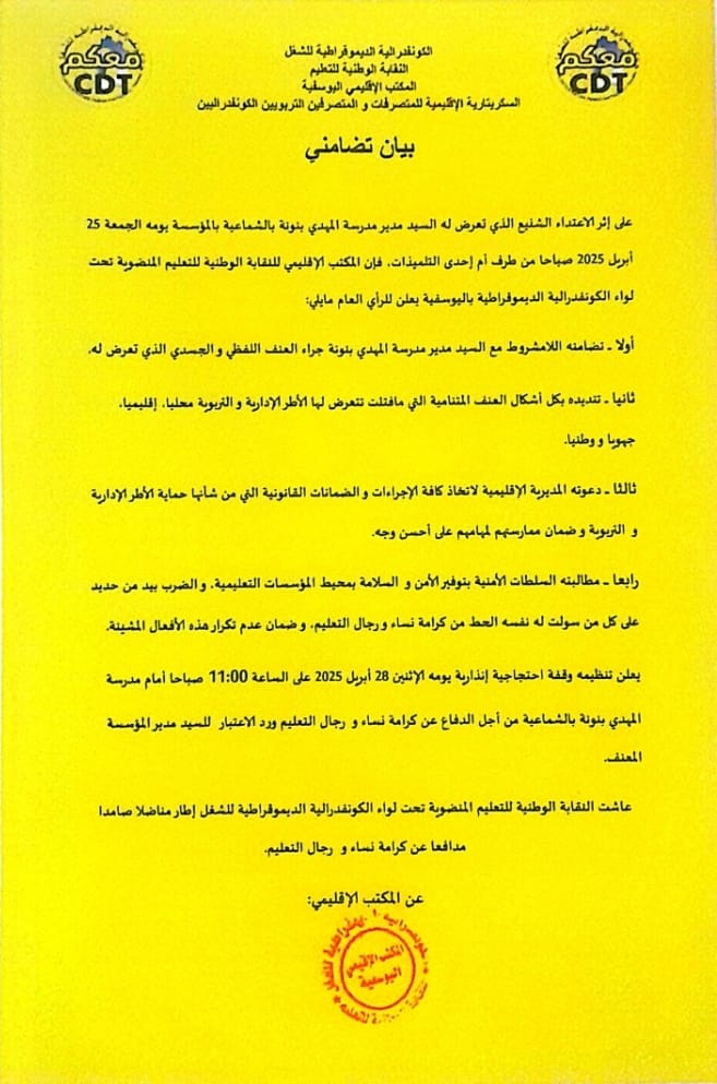 بيان تضامني للمكتب الاقليمي ك.د.ش النقابة الوطنية للتعليم اليوسفية مع مدير مدرسة المهدي بنونة بالشماعية هيئة التحرير 26 أبريل، 2025 اضف تعليق 2025-04-26 هيئة التحرير شاركها فسبوك تويتر قوقل بلوس LinkedIn