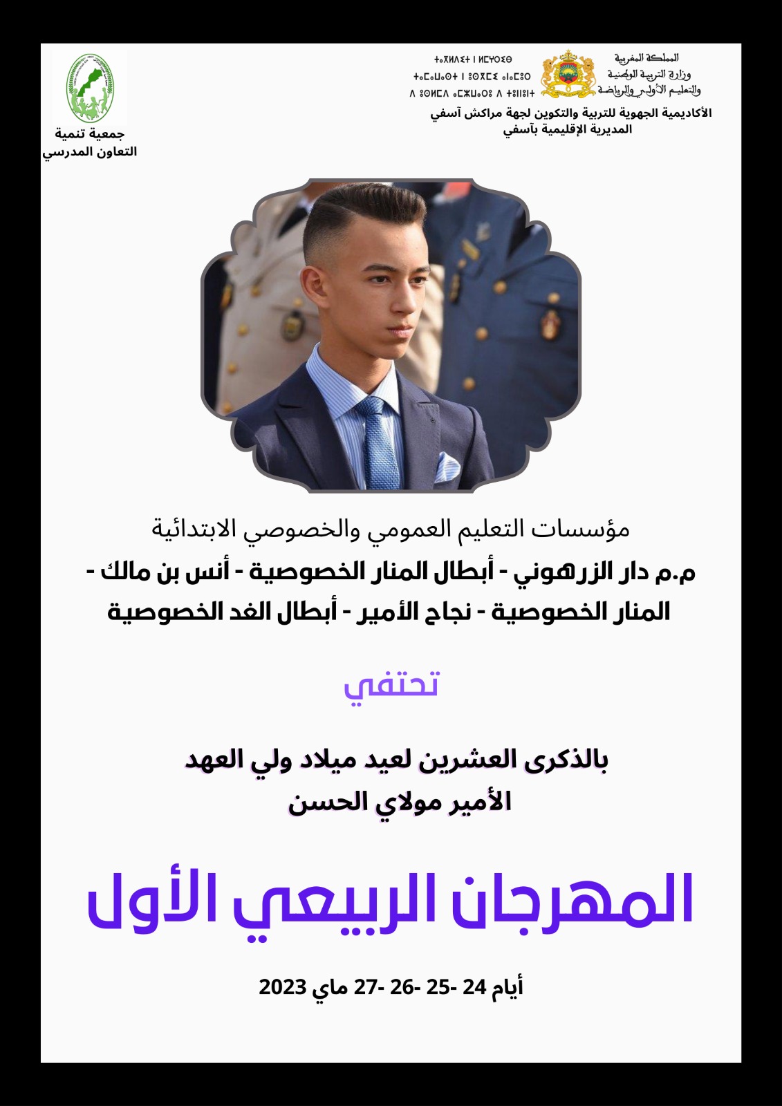 تخليدا للذكرى العشرين لميلاد صاحب السمو ولي العهد مولاي الحسن نظمت الجامعة الملكية المغربية لرياضة تنين السلام الدفاعية عصبة مراكش اسفي لرياضة تنين السلام الدفاعية، يوم 28 ماي 2023 بالقاعة المغطاة العريسة.. الإقصائيات الجهوية المؤهلة لبطولة المغرب بمشاركة أزيد من سبعين مشاركا في فئات عمرية و اوزان مختلفة يمثلون عدة جمعيات منضوية تحت لواء العصبة. حضرها جمهور غفير من أهالي وأصدقاء المشاركين. وقد استهلت هذه التظاهرة بايات من الذكر الحكيم وعزف النشيد الوطني. لتبدأ النزالات التي ابانت على مستوى مهاري و تنظيمي يعد بمستقبل زاهر للعبة، خاصة أمام رهان الطاقم التقني و الاداري للعصبة على الرفع من المستوى الفني و التنظيمي في أفق تنظيم ملتقيات وطنية ودولية من الحجم الكبير.