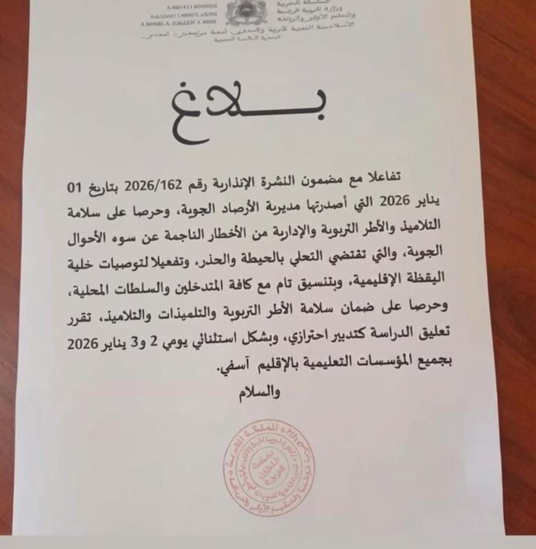 عاجل: تعليق الدراسة بآسفي بسبب سوء الاحوال الجوية …بلاغ هيئة التحرير 2 يناير، 2026 اضف تعليق 2026-01-02 هيئة التحرير شاركها فسبوك تويتر قوقل بلوس LinkedIn