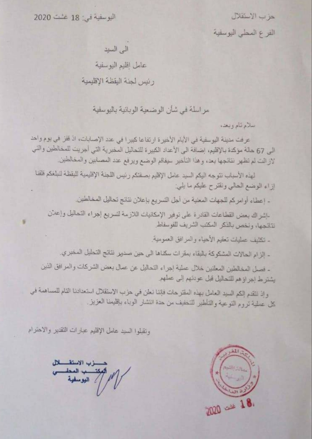 المكتب المحلي لحزب الاستقلال يراسل عامل اقليم اليوسفية بعد ارتفاع عدد الاصابات بفيروس كورونا المستجد هيئة التحرير 18 أغسطس، 2020 اضف تعليق موقع المنار توداي 18 غشت 2020. عامة مجتمع 2020-08-18 هيئة التحرير شاركها فسبوك تويتر قوقل بلوس LinkedIn