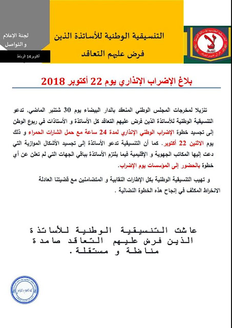 موقع المنار توداي//23//10//2018// اساتذة التعاقد باعدادية السلطان مولاي الحسن بالشماعية يض...